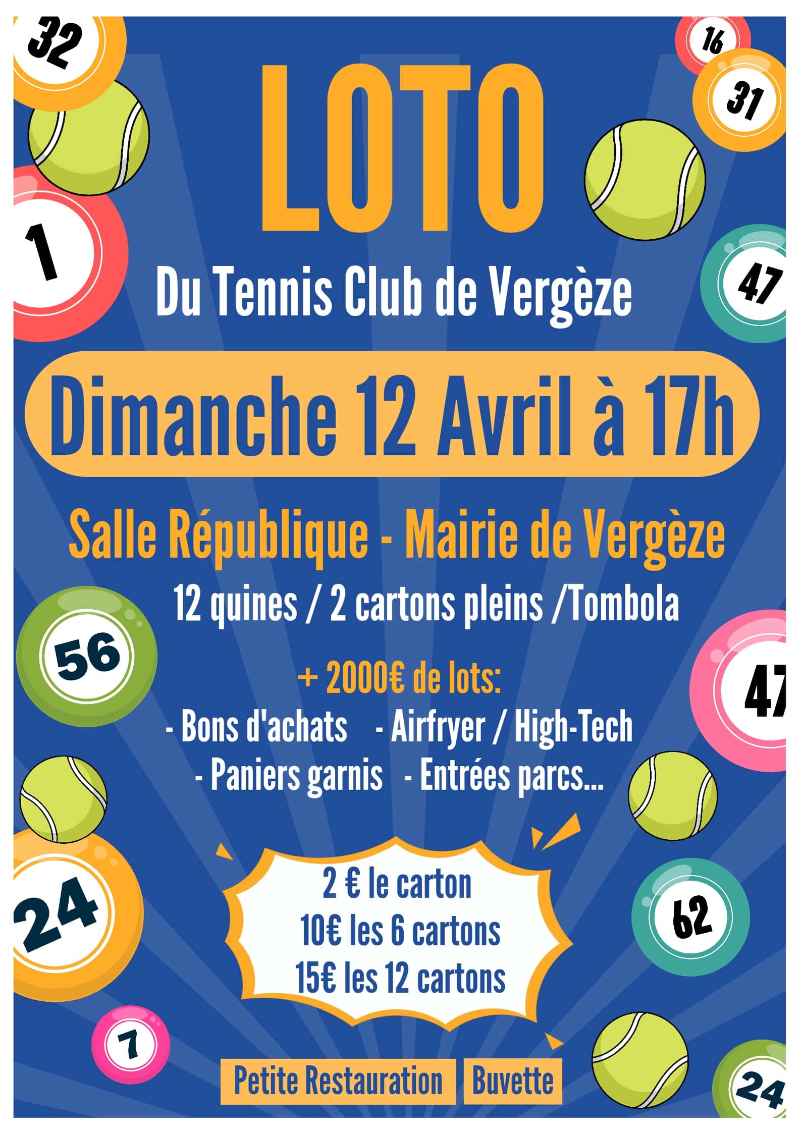 Le Tennis Club de Vergèze vous donne rendez-vous pour un moment convivial à l’occasion de son loto, le dimanche 12 avril à 17h, à la Salle République.