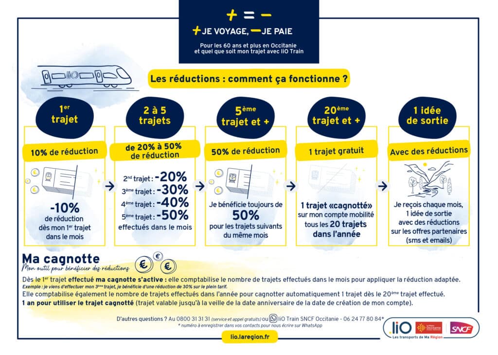 La Région Occitanie propose également l’offre + = –, dédiée aux voyageurs de 60 ans et plus, afin de voyager à prix réduit sur le réseau liO Train.