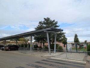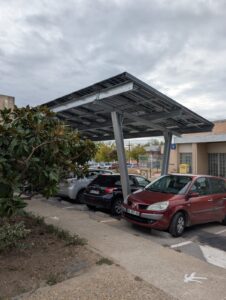 Commencées au mois d’août, les ombrières photovoltaïques abritant les places de stationnement situées devant l’école maternelle devraient être terminées pendant les vacances de Toussaint :